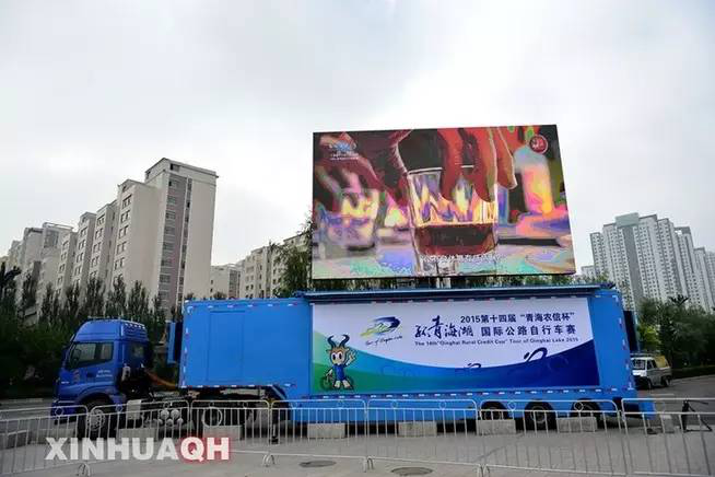 本届环湖赛采购的LED户外宣传车是一辆高清晰度、超大屏幕的户外广告车(直播车)。该车车厢长度为13米,屏幕升起,全车有三层楼之高,自动化程度非常高。该车由“上海景想”公司打造,具有防水防雨防风沙的效果,抗风能力可达到八级,并自带发电机。超大屏幕为43平方米,采用户外P6LED显示屏,大屏从车厢顶部升起后可以翻转180度折叠成一块超大屏幕,翻转到位后可作360度旋转。这辆先进的户外广告车的推出,为环湖赛及青海体育赛事的宣传推广,又增添了“利器”